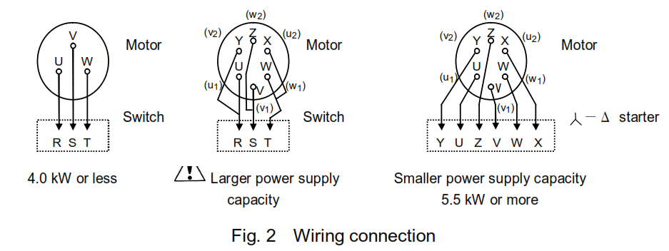 (1) Perform wiring in accordance with the instructions in Fig. 2, a connection diagram on the inner lid of the motor terminal box, or an instruction manual for the motor.