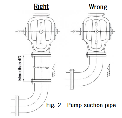 (2) Minimum number of suction elbows with bend radius as large as possible may be installed at some distance from pump inlet (Fig. 2)