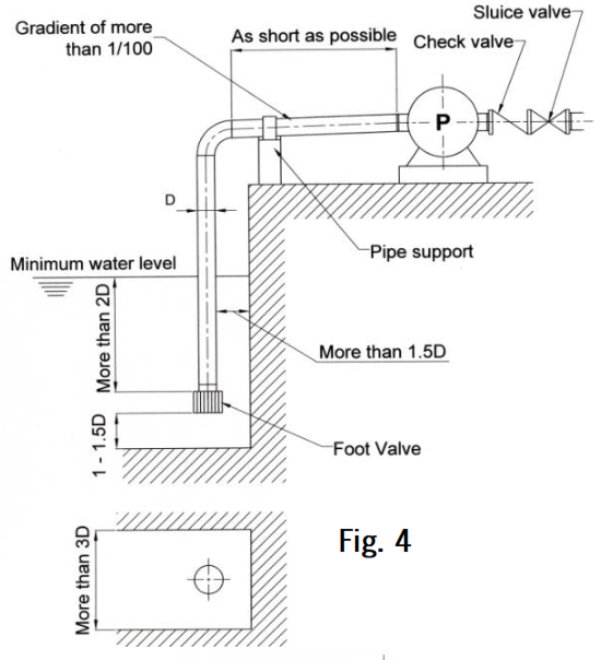 (2) Connect horizontal portion of pipe with a gradient of more than 1/100 toward pump, as shown in Fig.4.