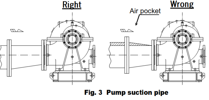 (5) If a pipe of different diameter than pump flange is used, an eccentric type reducer should be installed so as not produce any air pocket. (Fig. 3)
