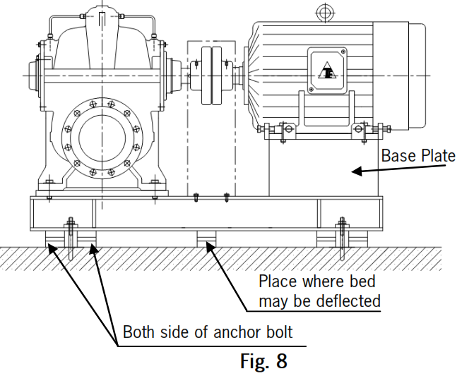 (8) After mortar has been harden, tighten anchor bolts securely again and connect pump suction and discharge piping. If shaft coupling offset