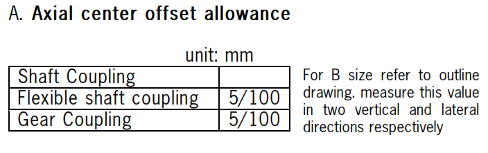After piping has been completed correctly, set the axial center offset of the shaft coupling of the pump and driver to less than the value shown in Fig. 8. Adjust this value by exchanging shims between the driver and common bed as required.