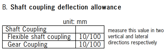 Perform centering while adjusting the taper liners. Axial center offset and surface deflection of coupling must be within the allowance shown in Fig. 9, while using a flat gauge, taper gauge, thickness gauge or dial gauge as shown in Fig. 9. Measure these values with anchor tightened. Be careful since these values very considerably according to whether anchor bolts