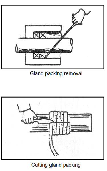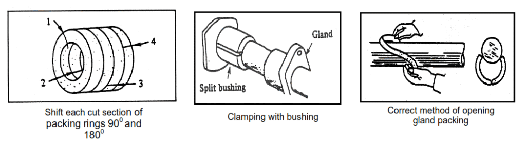 (b) Shift each cut section of packing rings 90°C and 180°C . Prepare two split bushing (wooden) or a short two split metallic bushing, place over the packing and push packing into the gland until seated.