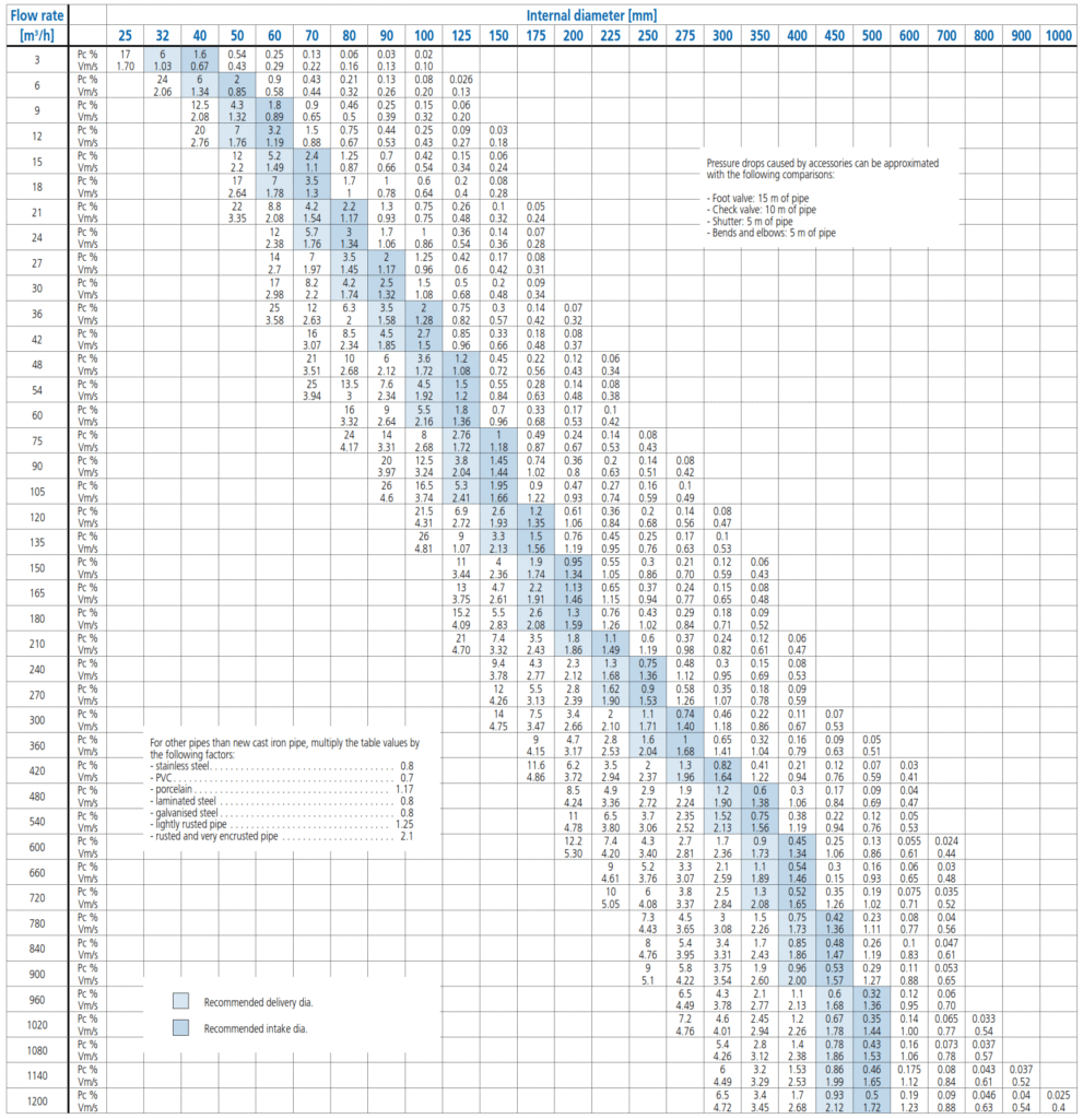 Pc= Pressure drop in water column metres per 100 m of new cast iron pipe.