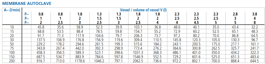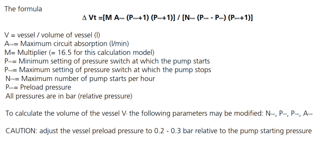 If we know the maximum circuit absorption in I/min (Amax) and the maximum number of pump starts permitted per hour (Nmax), the table allows us to calculate the necessary size of vessel.