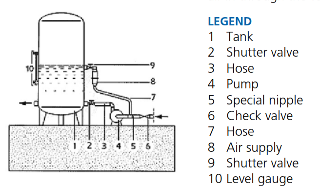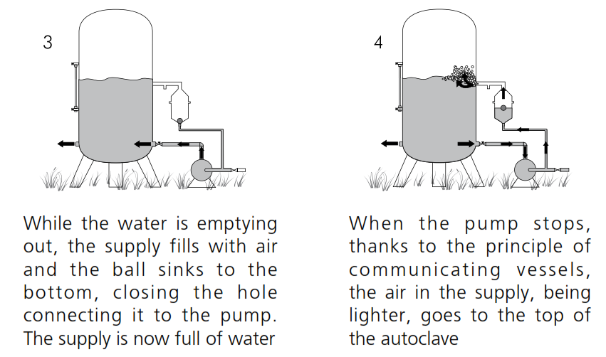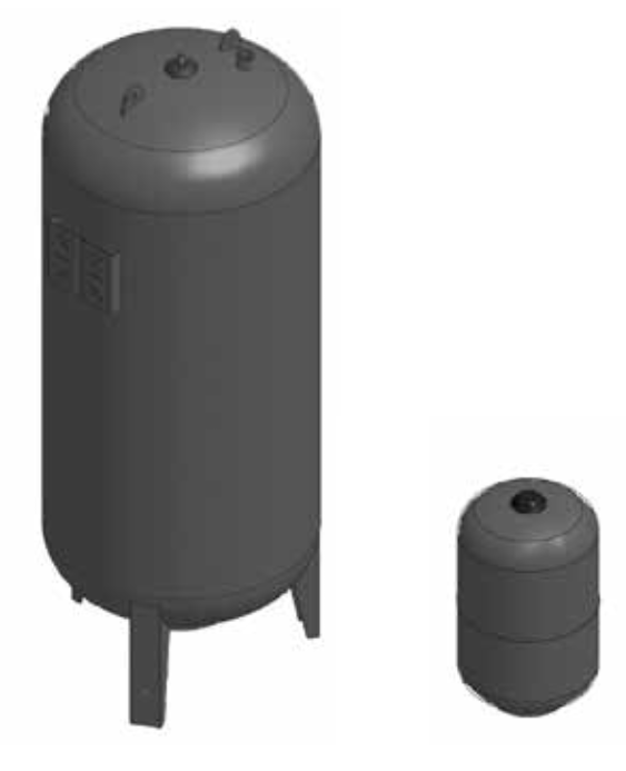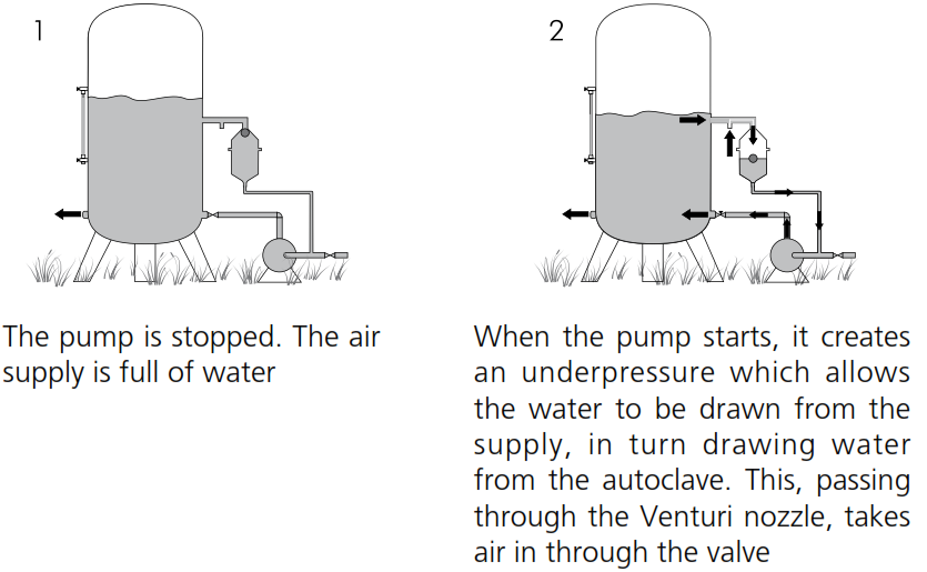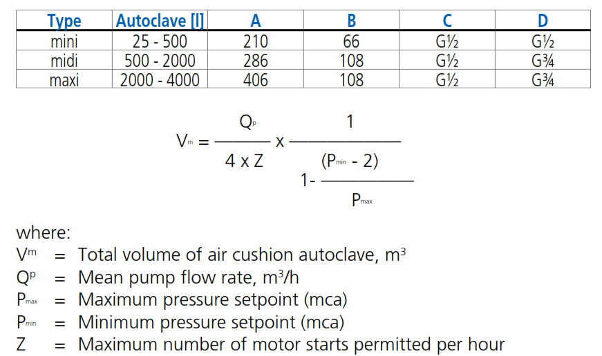 The supply pressure tank, or autoclave, is used to limit the number of pump starts per hour by supply part of its water reserve to the circuit, which is kept pressurised by the air above it. The autoclave may be of the air cushion or membrane type. In the membrane type there is no contact between the air and the water since they are separated by an elastic membrane inside the tank. In the air cushion type, there is no clear separation between the air and the water. Since the air and water tend to mix together to some extent, the separation must be restored by an air supply or compressor.