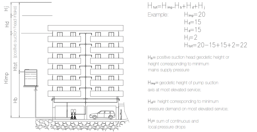 The head includes the level difference between the pump and the supply tank, if located at a lower level, and the difference between the pump